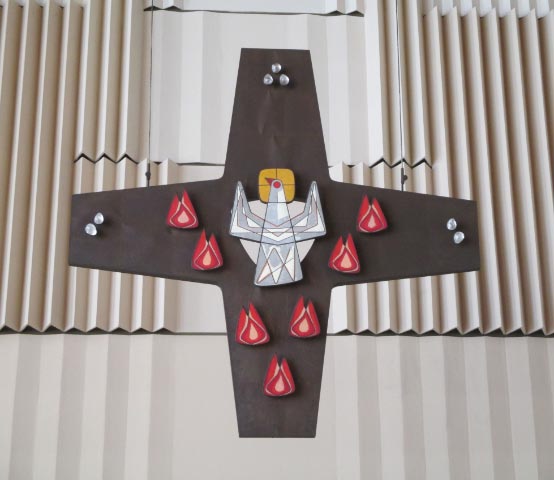 Altarraumkreuz mit Heilig-Geist-Taube und Feuerflammen