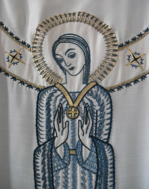 Weiße Kasel für Marienfeste, Detail der Rückseite, um 1950/60, Johann Georg Schreibmayr, München; Hannover, Vinzenzkrankenhaus (Kongregation der Barmherzigen Schwestern vom Heiligen Vinzenz von Paul)